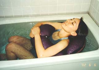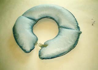 浴槽内でバランスが崩れ易い高齢者や肢体不自由者に、介助者の支えなしにお風呂が楽しめるよう介護職員が作った布製浮輪型入浴介助用品です。通気性、通水性のよい布に発泡スチロールビーズを充填してあり、浮輪型一端が開放されているので、腕を上げる苦痛なく体の側面から楽に着脱できます。また、発泡スチロールビーズの移動防ぐため、封止部を設け浮輪の安定を保ち、装着を容易にするための止め具と、体型に合わせて調節できるベルトを付けました。素材の特性上、カビ発生の心配も無く、使用後は掛けておくだけで水切れも早くお手入れも簡単です。数十ヶ所の施設・病棟・在宅等で、足腰が弱い高齢者や半身麻痺の人に使ってもらっており、手すりにしがみついていた人が、これを使うことによって、体を伸ばして気持ち良さそうに入浴することができたり、見守り介護のみで入浴できるようになりました。
