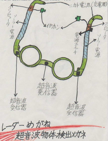 目の悪い人が、このめがね型機械によって、障害物を察知でき、1人で歩行できることを助けるものです。これは、主に視覚障害者や、高齢者が使う装置です。めがね型の機械で、鼻の上のフレームの所に、超音波発信器がついています。レンズのはしのこめかみ部分のフレームに超音波受信器が左右についています。これにより、超音波を発信し、障害物で反射した超音波を受信して、イヤホンを通して、両耳に提示して、障害物があるかないかわかる装置です。