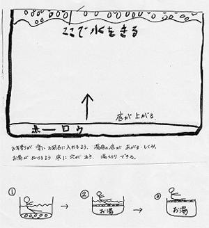 総合学習の時間にシルバー体験をし、自分達とお年寄りの体ではどのような違いがあるのかを考えさせました。その中で、お年寄りが湯舟に入るのが大変なので、楽に出入りできる機械を考えました。底板がそのまま上がると出入りは楽になりますが、水の重さで板があがらないかもしれないし、あがったとき水があふれてしまってもったいない。そこで、底板に穴をあければ、湯切りができ、お年寄りの体だけ持ち上げることができます。また、水もこぼれないのでエコになると思います。