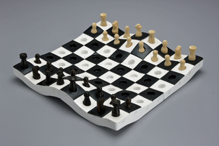 このチェスセットは視覚障害者でも使えるようなデザインです。視覚障害者はチェスを学びやすいように色々な特徴がこのデザインに与えている。昔、戦争があった時、山の上にえらい人が最後までいて、その高い場所からバトルを見ながらバトルフィールドで二つのチームが戦っていた。そのように想像した土地の形を盤面に与えた。盤面のマスの重要さは場所によって違うのでマスの高さでその違いを表す。チェスではゲームする時いつもポジションを発表しながら進めるので、お互いの位置は把握できる。こういった理由で視覚障害のあるゲーム初心者にとって理解しやすいと考える。