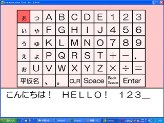 本装置は、ALSなどの肢体不自由な重度障害者のコミュニケーションシステムとして開発されました。 光学式センサを用いてまぶたなどの微動を察知する検出部、パソコンとUSBを用いて接続することにより任意キーの入力操作ができるインターフェイス部と、PCアプリケーションの3要素で構成されています。 瞬きによりPC画面上の仮想キーボードのカーソルを移動・決定し、言葉を表示することができます。 動作検出には光学式センサを用いており、瞬きや筋肉の微動を非接触で感知することができます。したがって、皮膚への刺激がなく、装置を長時間装着していても使用者の負担を少なくすることができます。