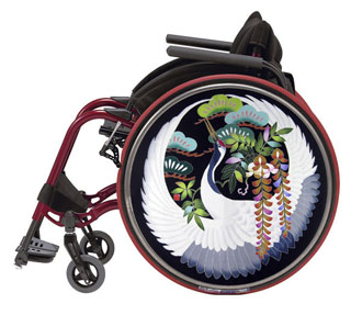 車いすスポークカバーは、車輪のスポーク部分を覆うことで、車いすを操作する際に手の巻き込みを防ぐ目的で用いられている。現状のスポークカバーは、プラスチック製で、回転軸となる中心に穴があいていたが、車いすは屋内で使用する場合が多く速度が低いことから、車輪全体を覆う布製のスポークカバーを開発した。従来のように回転する部分がむき出しにならず、手のあたりが柔らかい、インテリアにマッチする特徴がある。 従来品はキャラクターを中心とした子供向けのデザインのものが殆どであったが、若者や高齢者などからは大人向けのデザインや、オーダーメイド品が強く望まれていた。そこで、石川県のブランドである加賀友禅、加賀小紋、若者に好まれそうなデザインシリーズ、高齢者向けの和柄など約30点のデザインバリエーションを展開した。普段使いだけでなく、結婚式場やパーティーなどで正装する際に車いすをドレスアップしたいというニーズに答えるため、加賀友禅シリーズは若手作家による手描きの一品製作も可能とした。また、インクジェットプリントを用いて自分で書いた絵などをオーダーメイドもできるようにし、世界で一台の自分だけの車いすのデザインができるようにした。