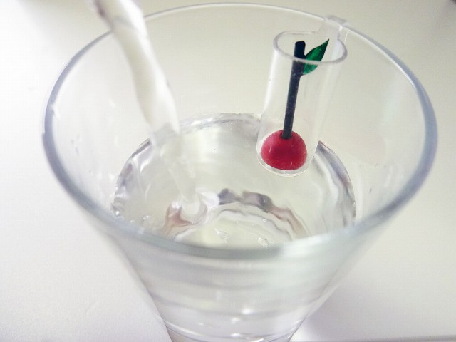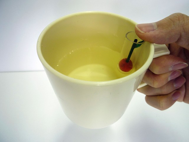 コップに飲み物を注ぐ際、コップにストッポンを取り付け、上がってきたリンゴ型の浮きに指が触れることで、視覚障がい者の方でも適量の飲み物をこぼさずに注ぐことのできる自助具です。 日常生活に欠かせない「飲み物をコップに注ぐ」という行為から、視覚障がい者の大きな不安を解消し、生活を便利にします。 ≪ 使 い 方 ≫ @ストッポンをコップの内側(持ち手側)に引っかける。 Aストッポンの上に軽く指をかざしながら飲み物を注ぐ。 Bポン!と指にストッポンの浮きが触れたらストップ!