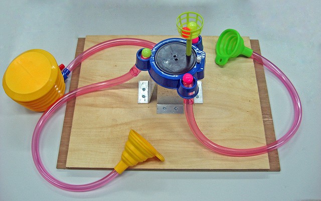 発語が不明瞭な、また、肢体不自由(手や足)の生徒・児童のために何かリハビリになるようなものがないかと考え機器を考案しました。 簡単な玉入れゲームですが、ホースでつながったジョウゴから息を吹き込みシュートすることで口周辺の筋肉を動かし発語の明瞭化を図ります。 また、口以外でも手や足を使ってポンプを動かすことで手や足のリハビリにもつながり、児童・生徒が安全に使用でき楽しみながらリハビリをする機器です。