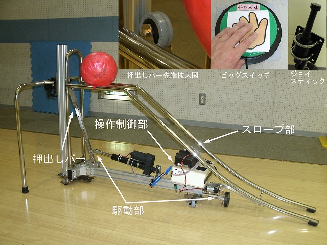 この作品は、重度肢体不自由者がボウリングゲームを楽しむための支援機器である。市販されている「ボウリング用スロープ」に手を加え、ボールを押し出す機能と転がす方向を定める機能を電動アクチュエータにより実現し、その操作を『ジョイステック』や『1個のスイッチ』で可能にした機器である。 具体的にはスロープ頂点にボールを置き電動で動く「押出バー」が後方からボールを前方に押し出すことによりボールはスロープ上を下り、レーン上にボールを転がすことができる。またスロープ先端に「電動駆動輪」を設置し、ボールをセットする後方を軸として左右10度程度旋回させることでボールを転がす方向も設定できる機構とした。