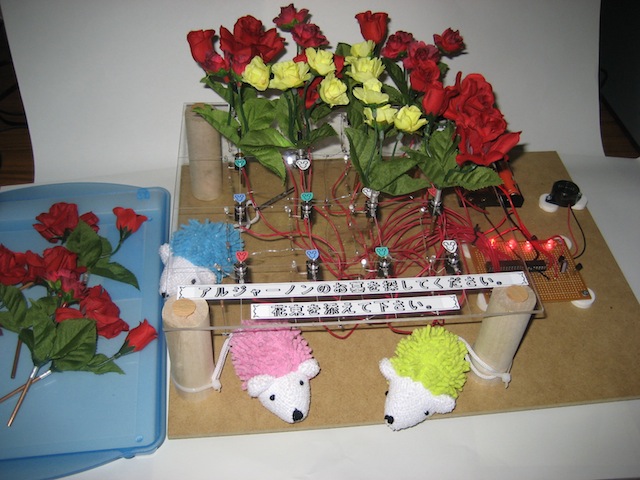 この機器は、簡単なペグさしをゲーム形式にしたものです。16個の穴に花を順番に挿していくと一ヶ所だけ大当たりの場所があり、光と音で知らせます。大当たりの場所はランダムで決められるので何度でも挑戦できます。楽しさや面白さを感じさせながら知的障がい(自閉症)の児童・生徒の作業能力の改善や自立訓練、高齢者の老化防止、認知症予防、手指の障がい(軽度麻痺や事故による障がいなど)のリハビリを行う機器です。
