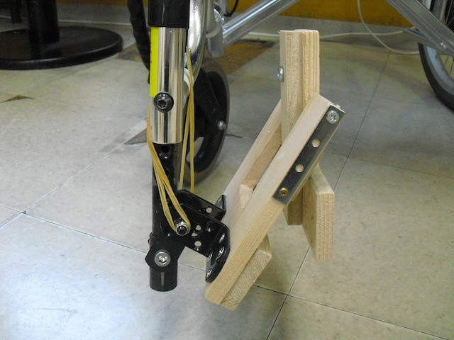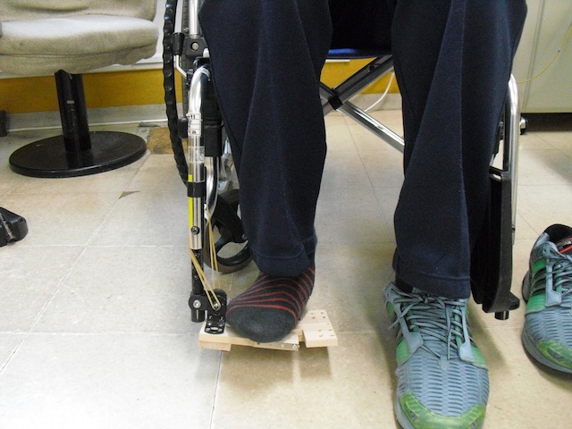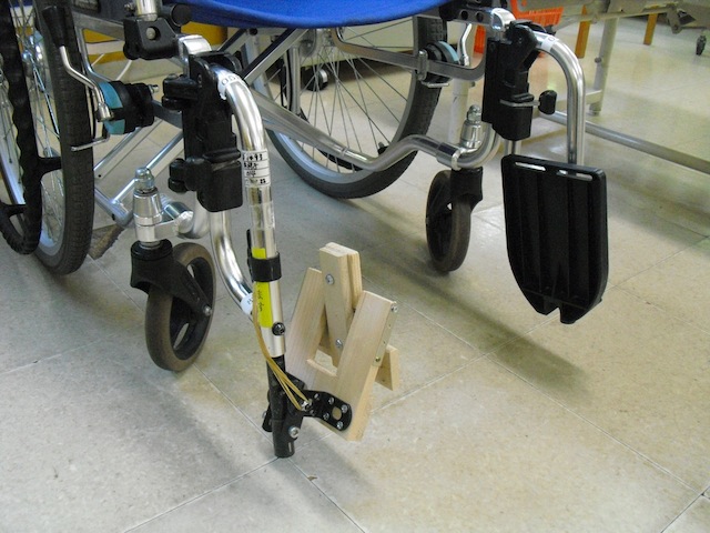 車いすのフットプレートに足を乗せる際には、足裏で一度フットプレートを下げ、そこに足を乗せるという2段階の動作が必要になります。また、フットプレートを下げるためには、足を高く上げなければならず、これが困難なために自分で足をフットプレートをに乗せられなかったり、手でフットプレートを下げようとして転倒したりすることがあります。そこで、折り畳み式フットプレートを考えました。これは、持ち上げた足を横にずらしながら下ろすことで、フットプレートが開くため、1回の動作で足をフットプレートに乗せることが出来ます。また、折り畳みになっている分、持ち上げる足の高さも通常よりも低くて済むようになっています。さらに、フットプレートに乗っている足を内側にずらすことで、自動的にフットプレートが折り畳まれるため、フットプレートを足や手で持ち上げるとういう動作が必要なくなります。