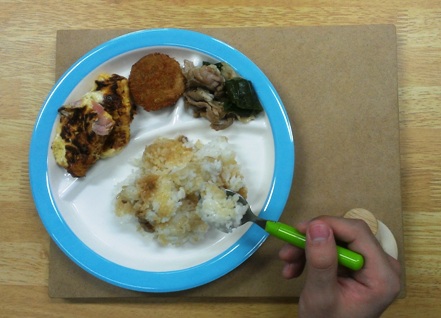 この作品は、介護施設で働いている方の「回転テーブルのようなお盆が欲しい」という意見を参考に作成しました。そこで、左半身麻痺の方を対象にしたランチプレートを作成し、「自分自身で食事を楽しんでもらいたい」というコンセプトで開発しました。通常の食事では、茶碗を持つ、皿を移動させるといった行為は両手を使わなければなりません。そこで、右手だけで皿が回転して、元の場所に戻せるようにしたのがこのまわるランチプレートです。ハンドルを回転させることによって、食器が回転し別の料理を手前に持ってくることができます。ハンドルの操作以外では食器が動くことはないので、利用者の方は安心して食事をすることができます。また、箸を使って直接ハンドルを回転させることもできるようにしました。