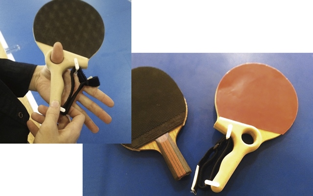 卓球はさまざまな年代の方が安全に遊ぶことができ、遊び方を工夫することで障害の有無に関係なく楽しむことができます。そのような卓球を、ラケットを握ることが難しい方も楽しむことを目的として製作したものがこのラケットです。 ラケットは、バンドで手に固定することで保持します。これにより、モノを握ることが難しい方も卓球を楽しむことできます。グリップは丸みをつけて手になじみやすく、扱いやすいように設計されており、バンドでの固定により安全に保持されます。