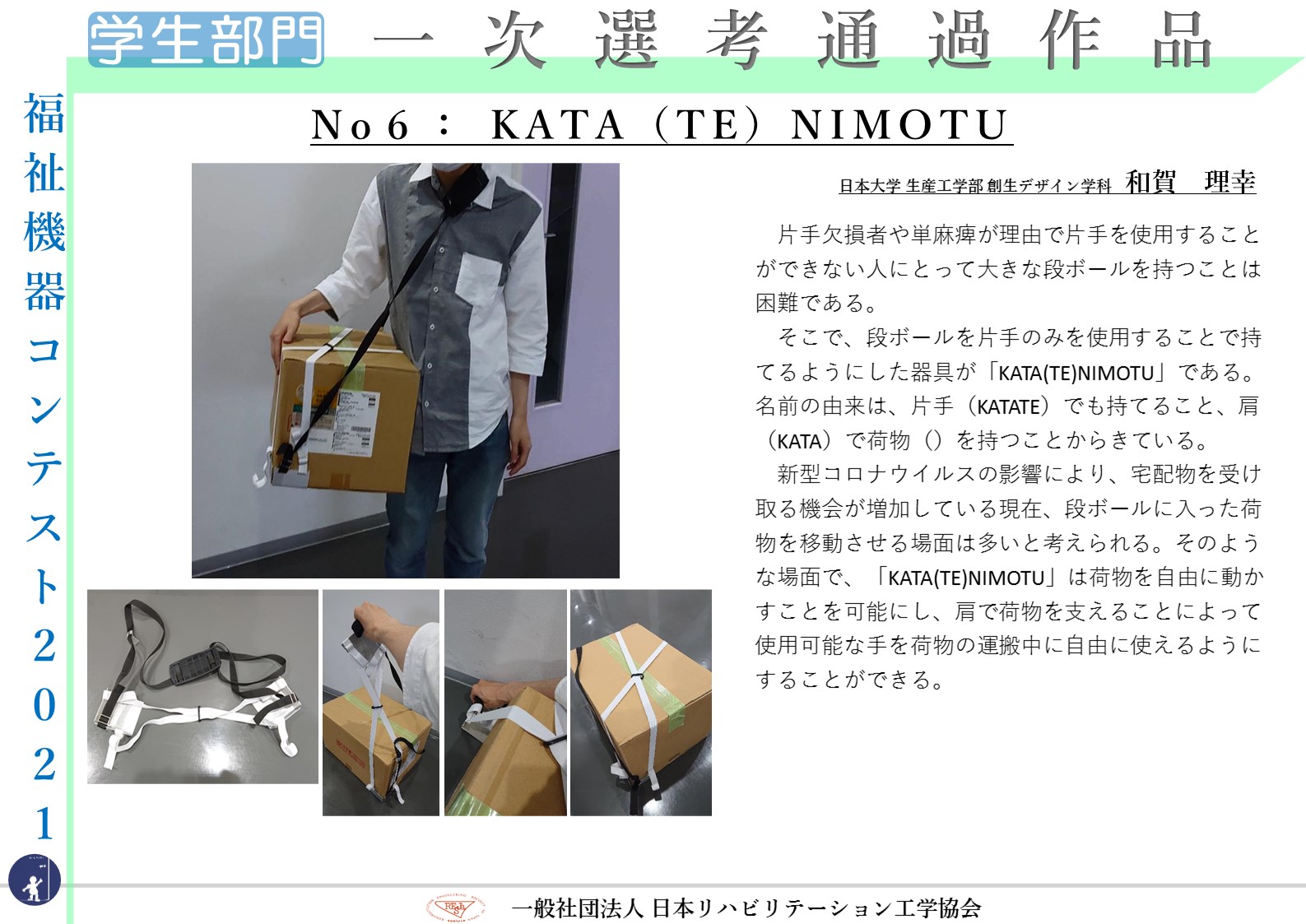 そこで、段ボールを片手のみを使用することで持てるようにした器具が「KATA(TE)NIMOTU」である。名前の由来は、片手(KATATE)でも持てること、肩(KATA)で荷物()を持つことからきている。