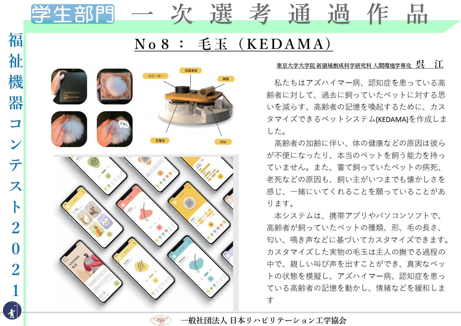 私たちはアズハイマー病、認知症を患っている高齢者に対して、過去に飼っていたペットに対する思いを減らす、高齢者の記憶を喚起するために、カスタマイズできるペットシステム(KEDAMA)を作成しました。